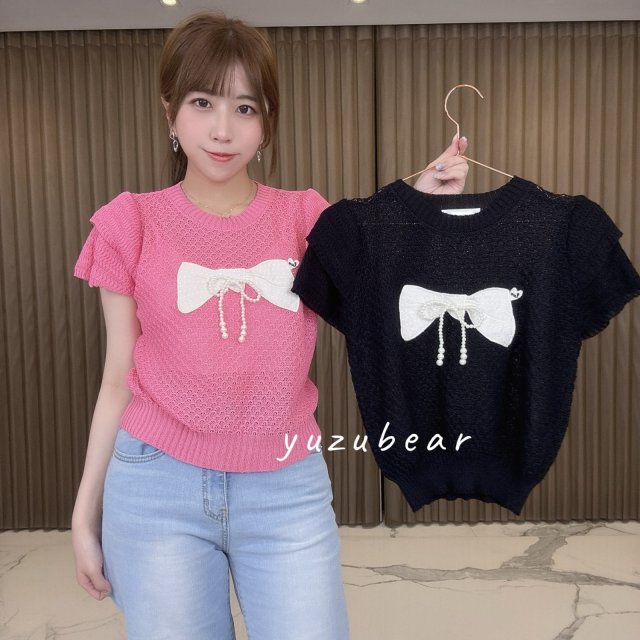 hk24 韓國珍珠蝴蝶結兩層公主袖針織衫
