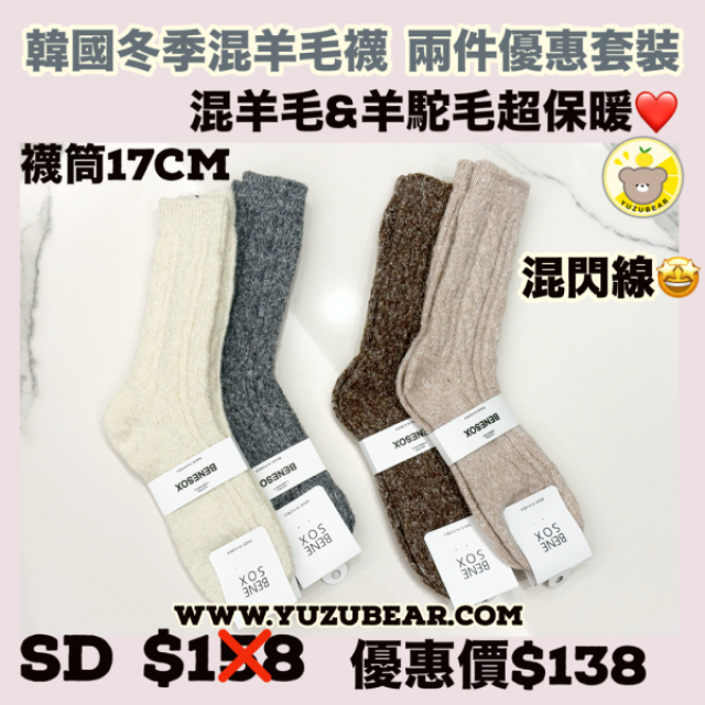 SD 韓國襪 - 混羊毛,cashmere羊駝毛,兔毛 混閃綫冬季襪 2件套裝(現貨)