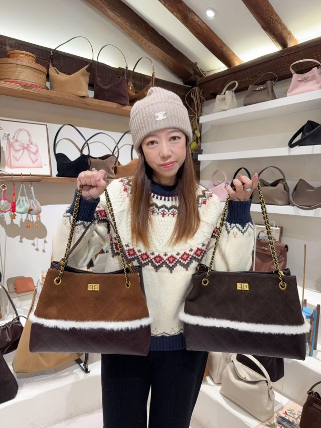 DG4 韓國高質真皮手袋猄皮拼布毛毛小香風袋手柄可拆,3way