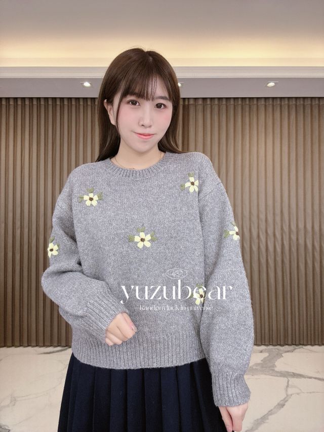 au115 韓國高質花花刺綉圓領冷衫(羊毛6%)(灰色現貨)