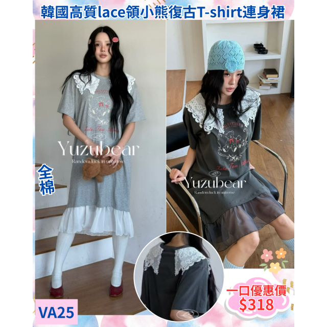 va25 韓國高質lace領小熊復古全棉T-shirt連身裙