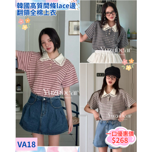 va18 韓國高質間條lace邊翻領全棉上衣