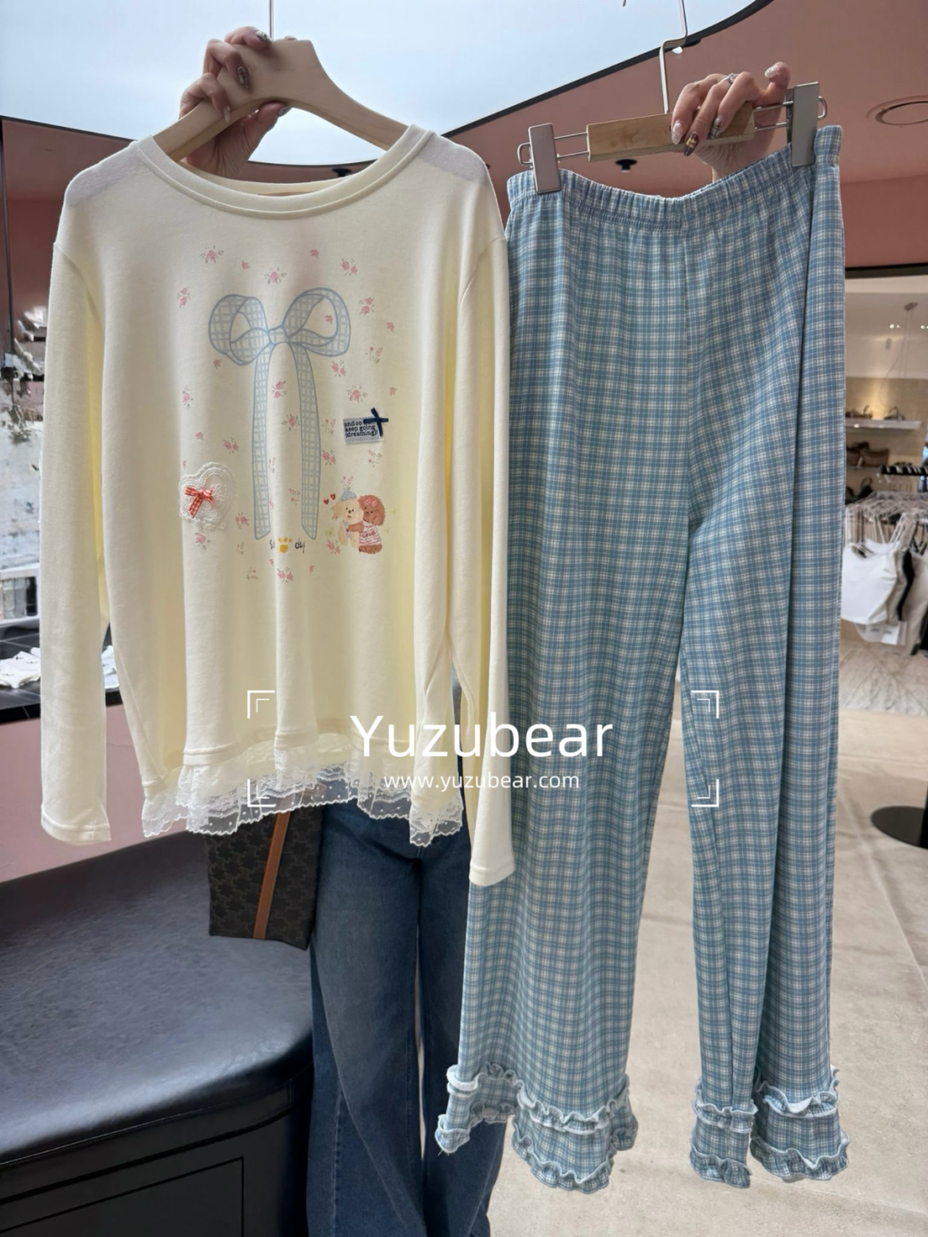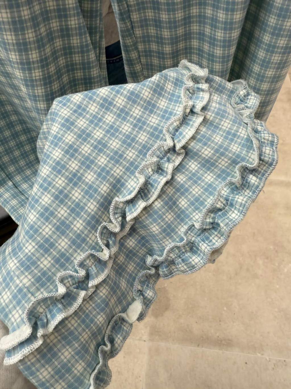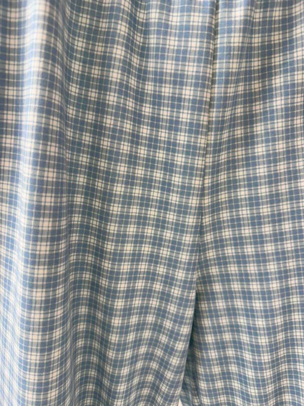 PJ12 韓國高質蝴蝶花邊腳格仔褲睡衣(米色x淺藍)