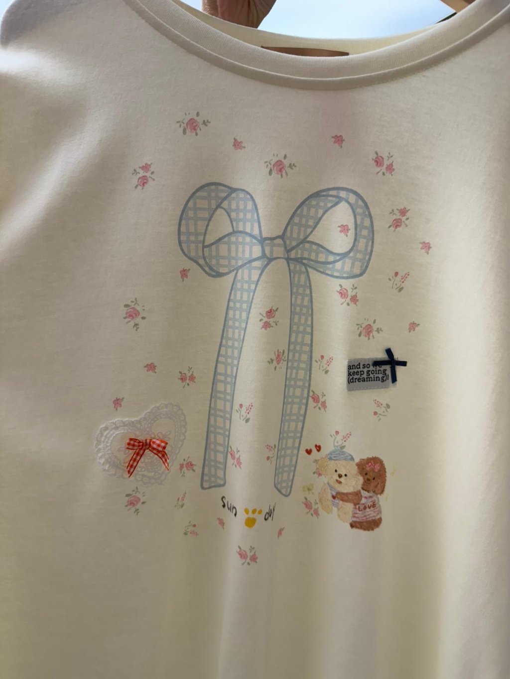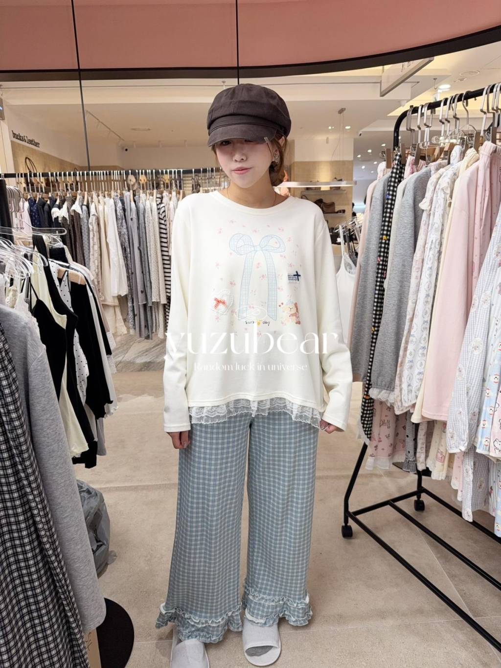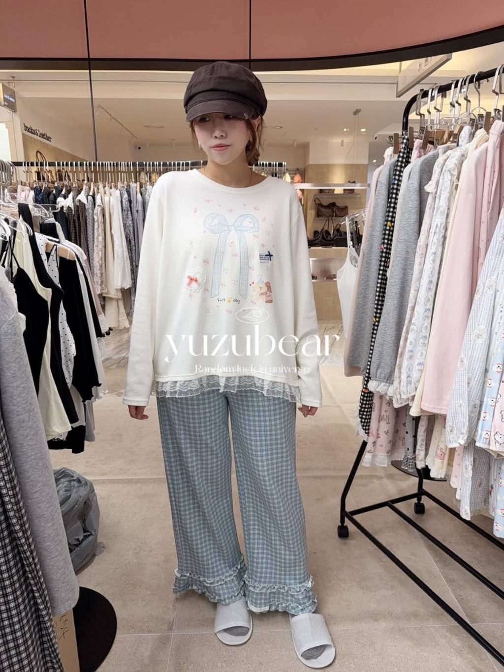 PJ12 韓國高質蝴蝶花邊腳格仔褲睡衣(米色x淺藍)