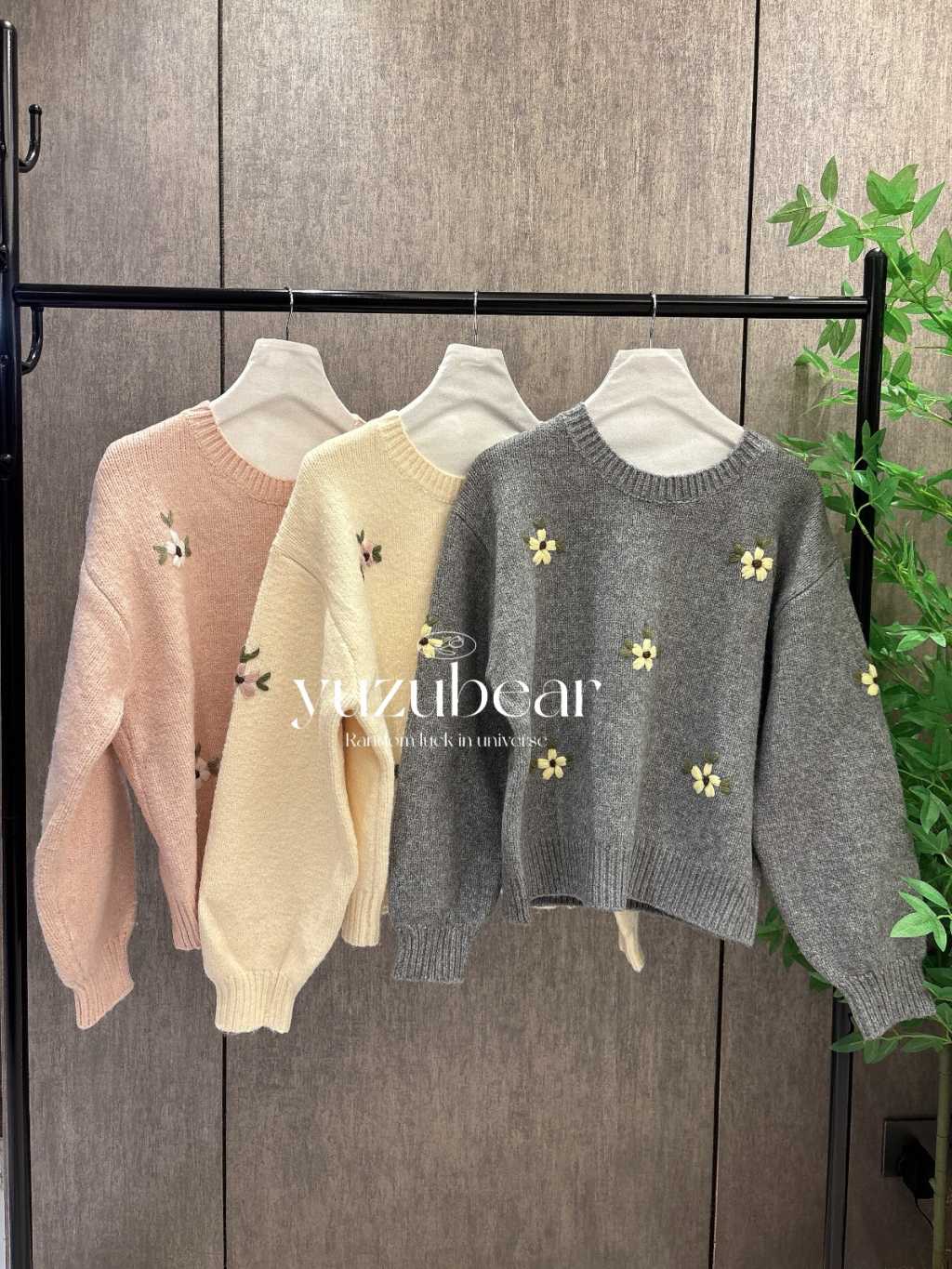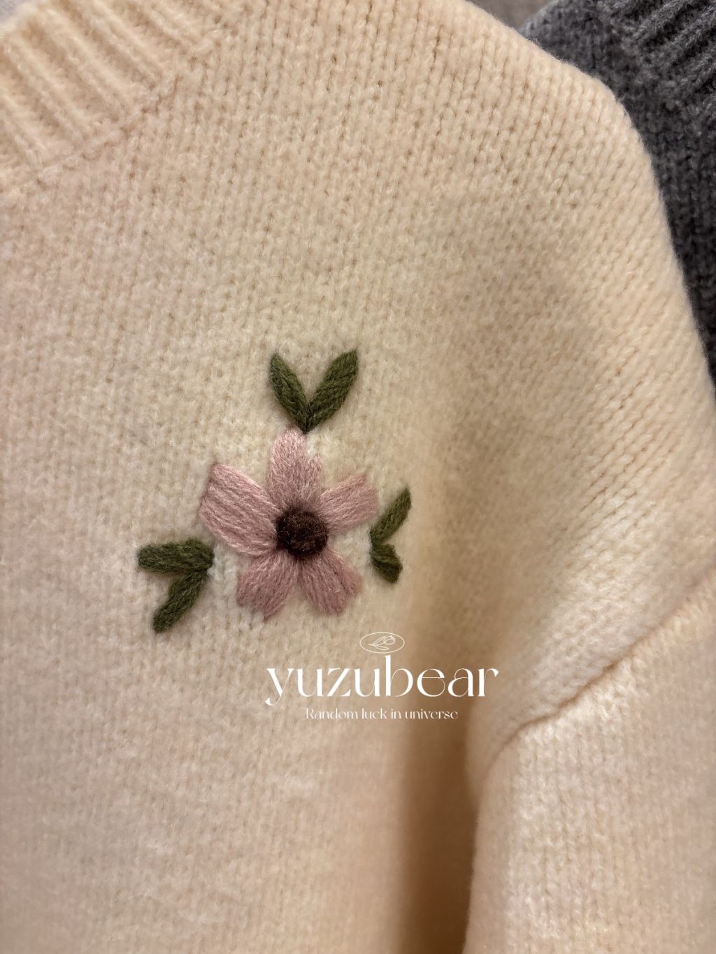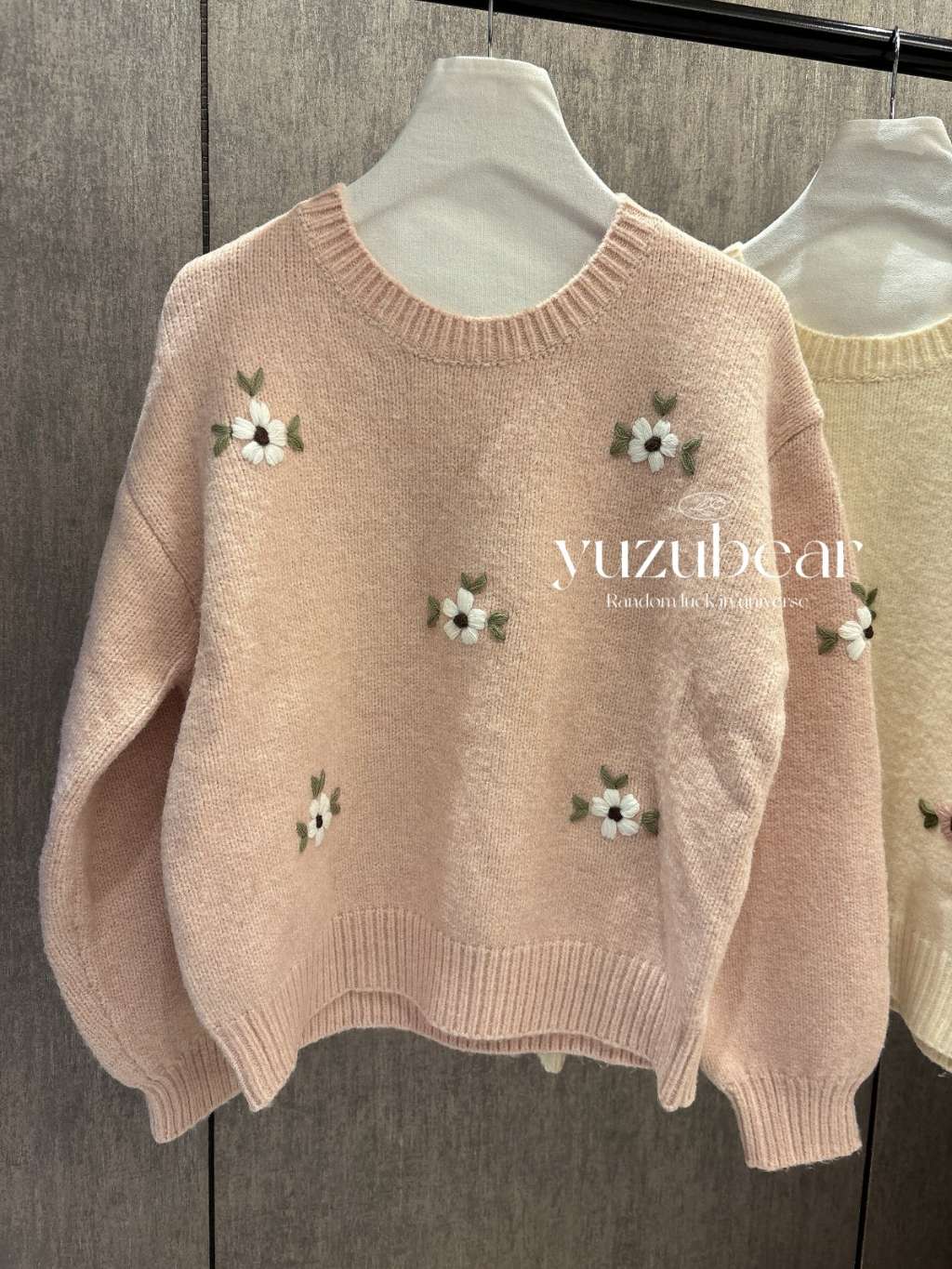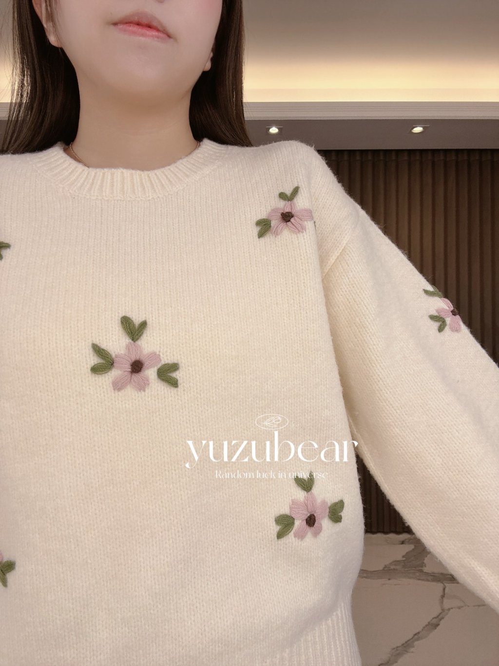 au115 韓國高質花花刺綉圓領冷衫(羊毛6%)