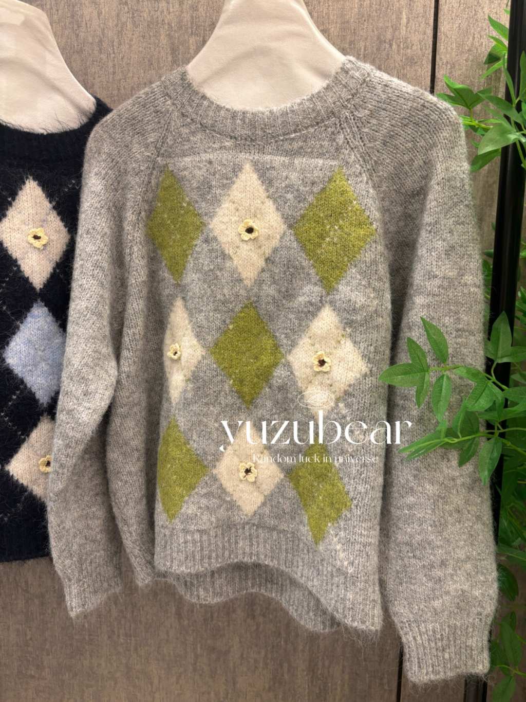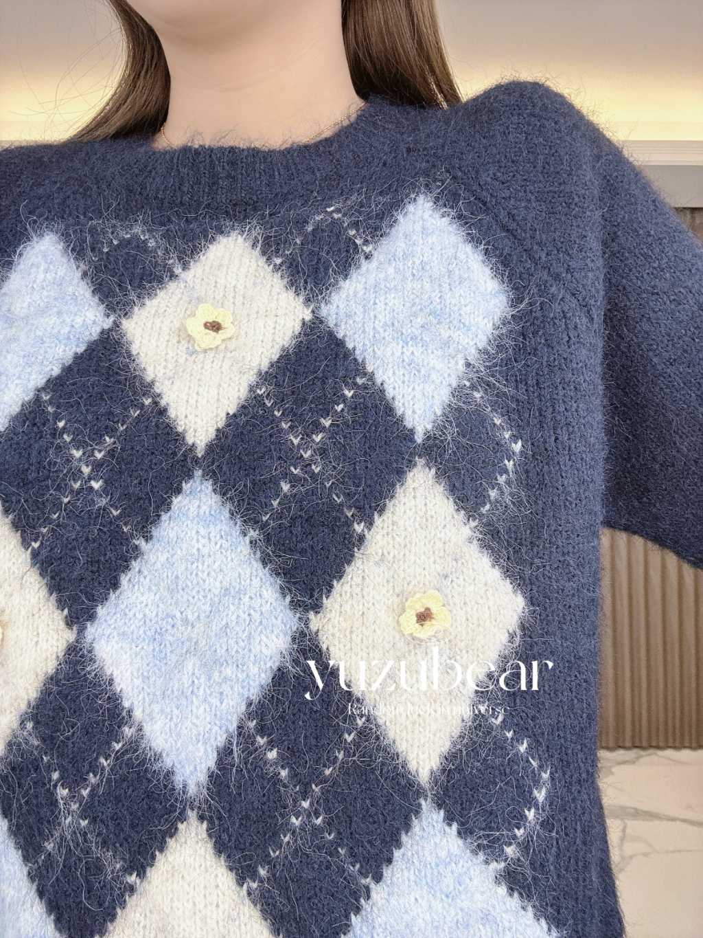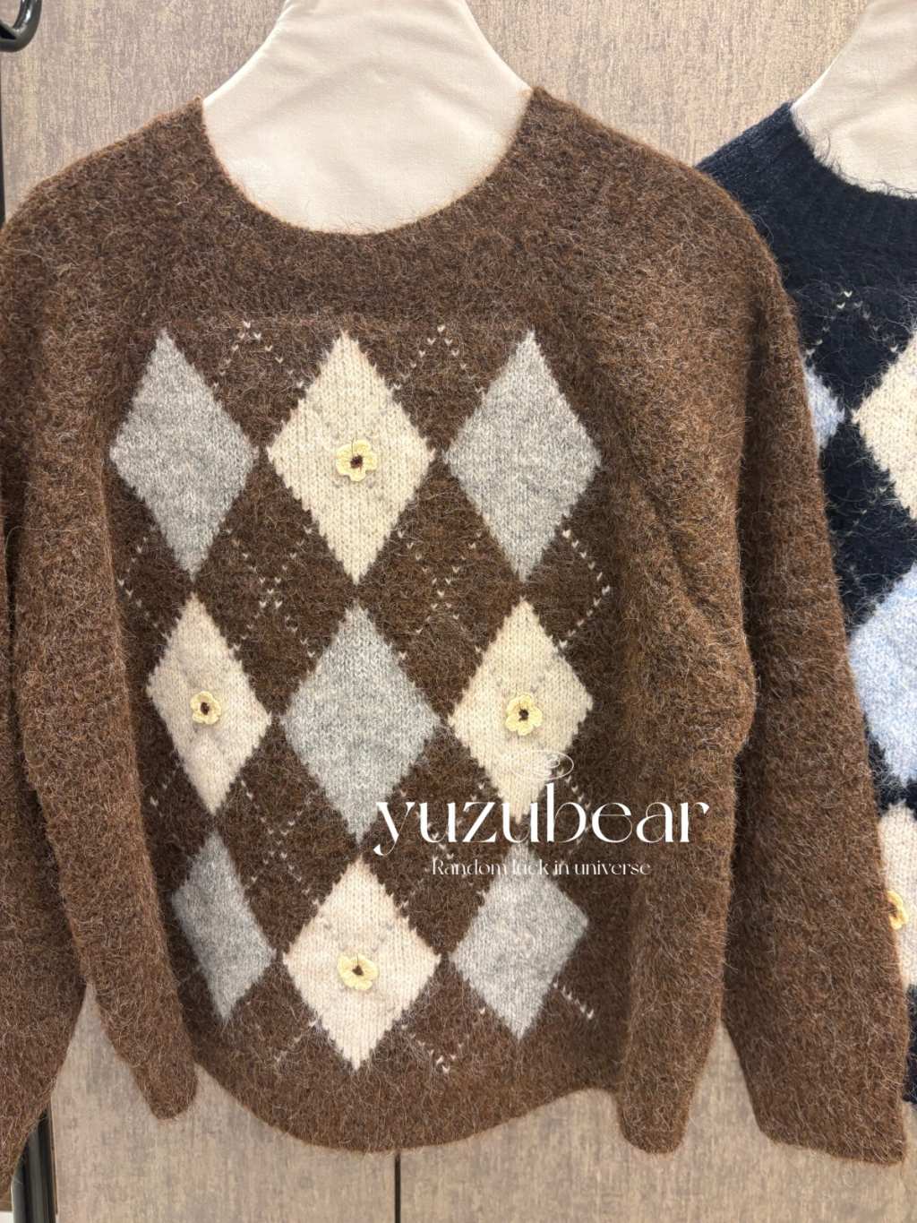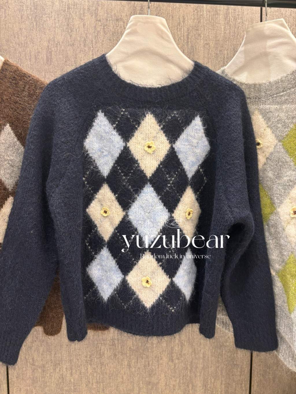 au123 韓國高質菱格花花刺綉圓領冷衫(羊毛65%)