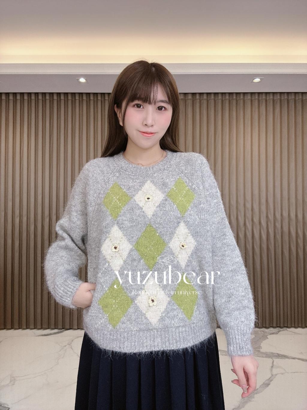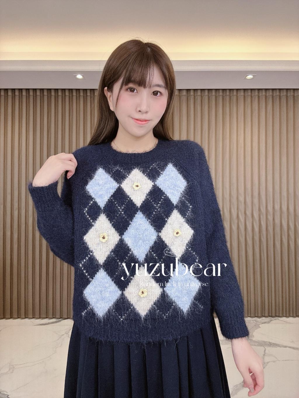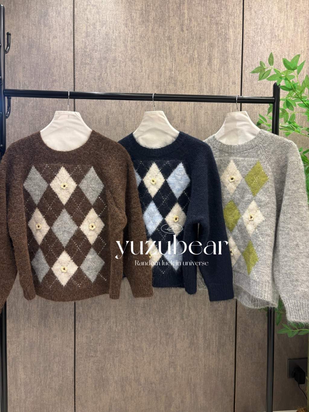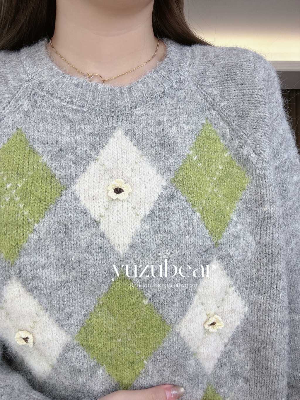 au123 韓國高質菱格花花刺綉圓領冷衫(羊毛65%)