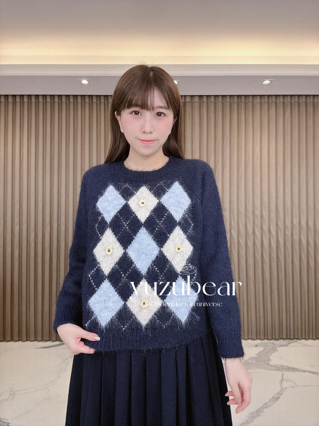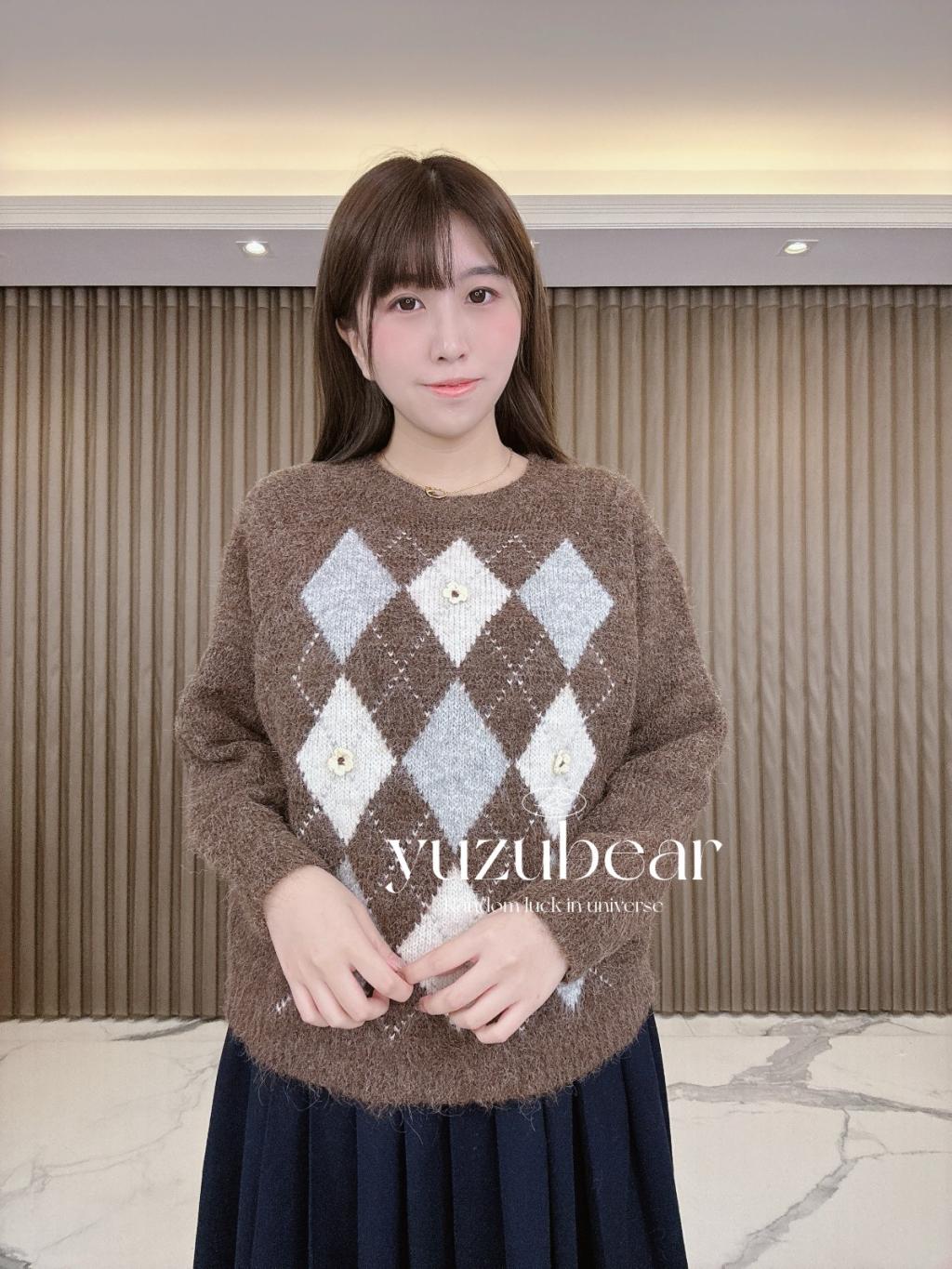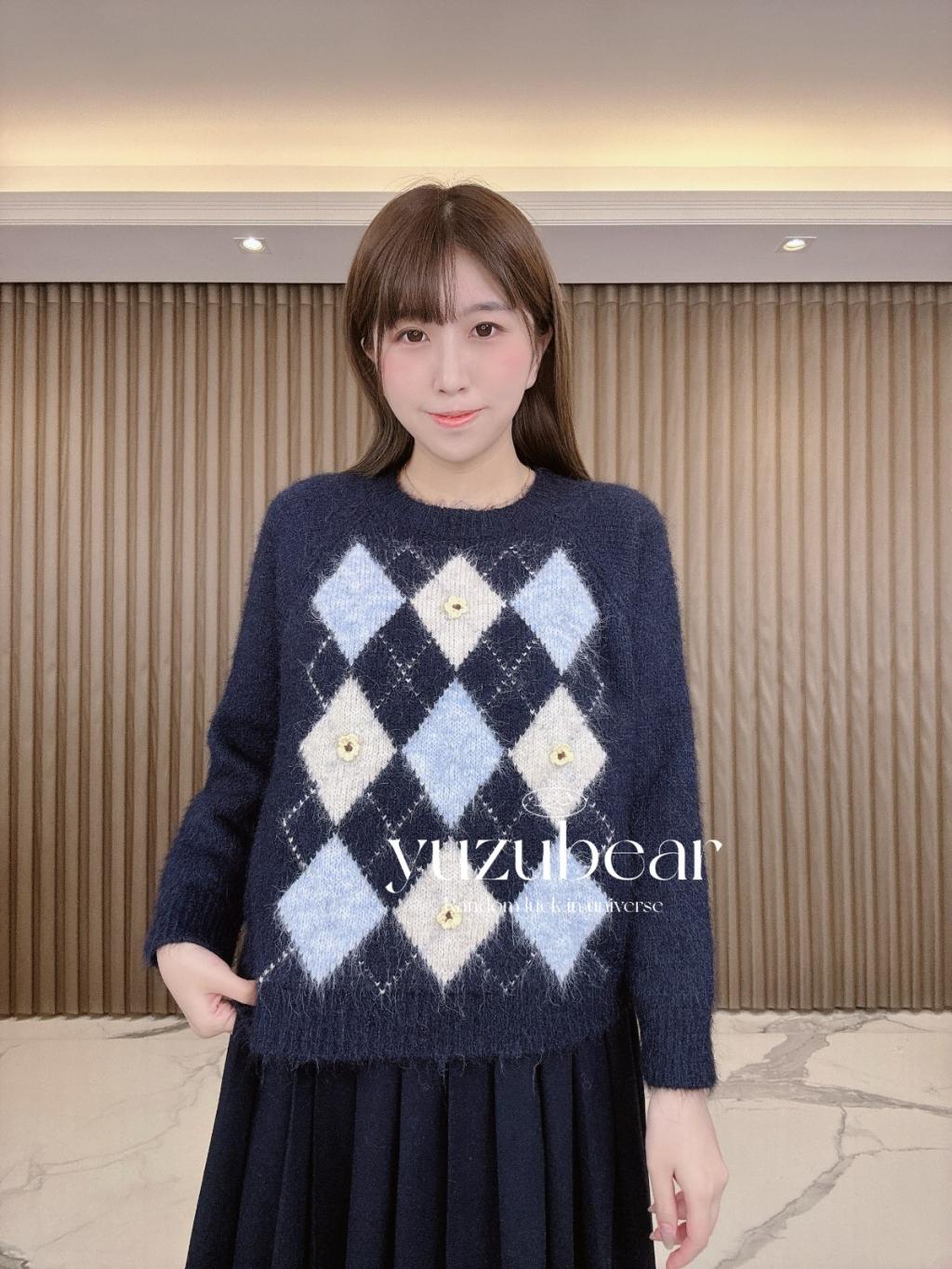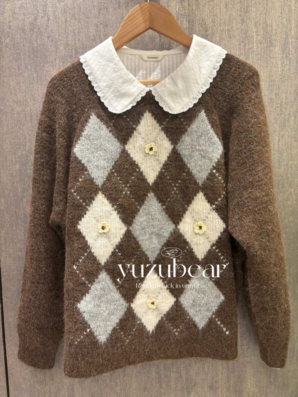 au123 韓國高質菱格花花刺綉圓領冷衫(羊毛65%)