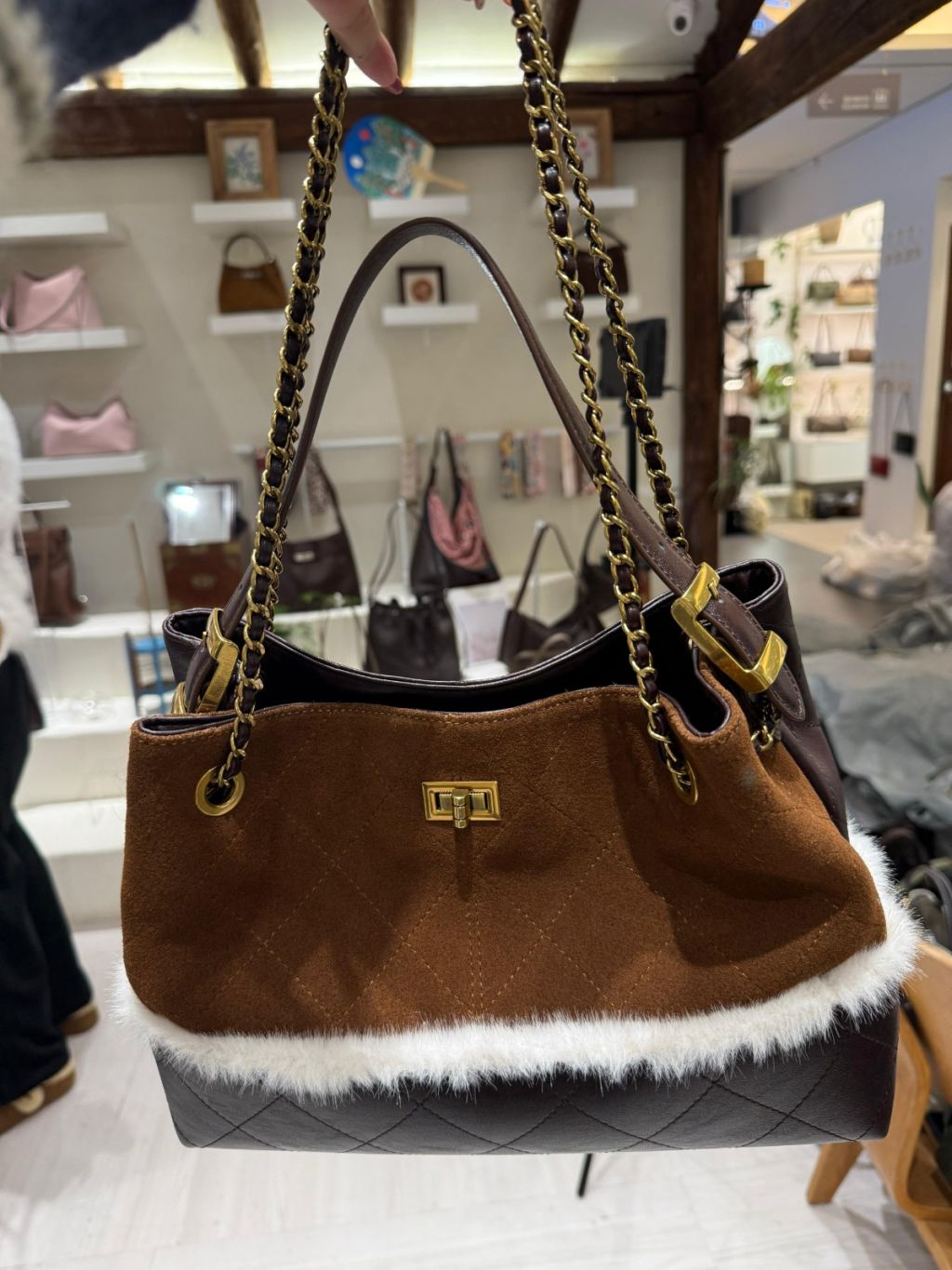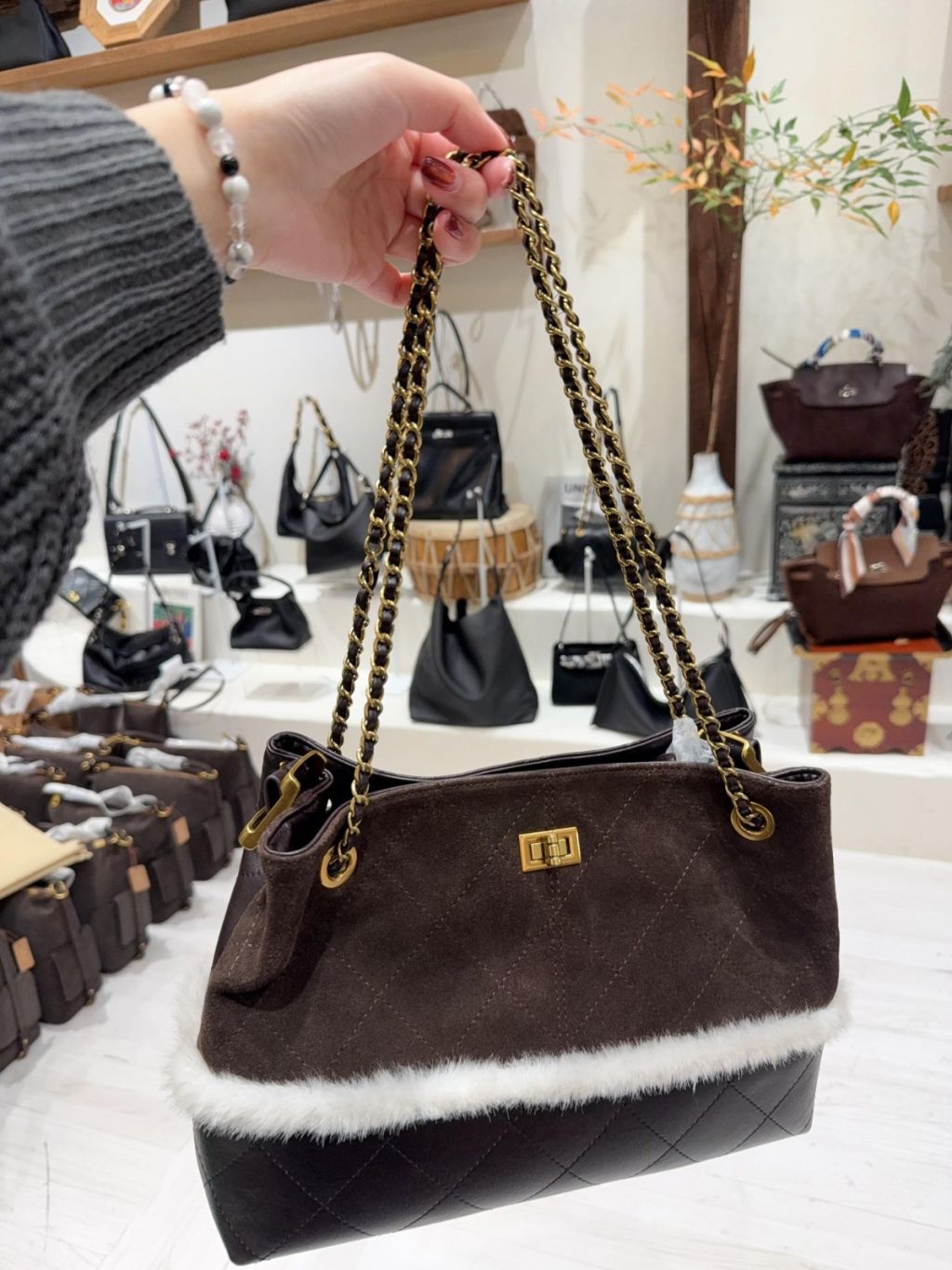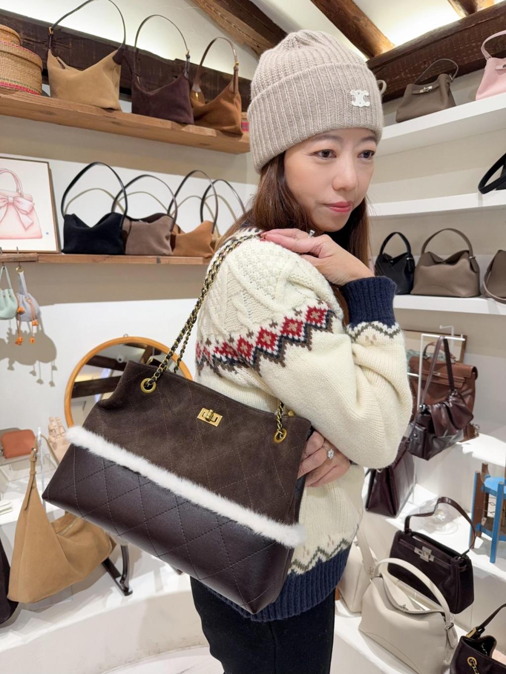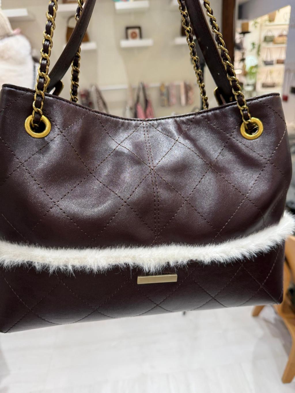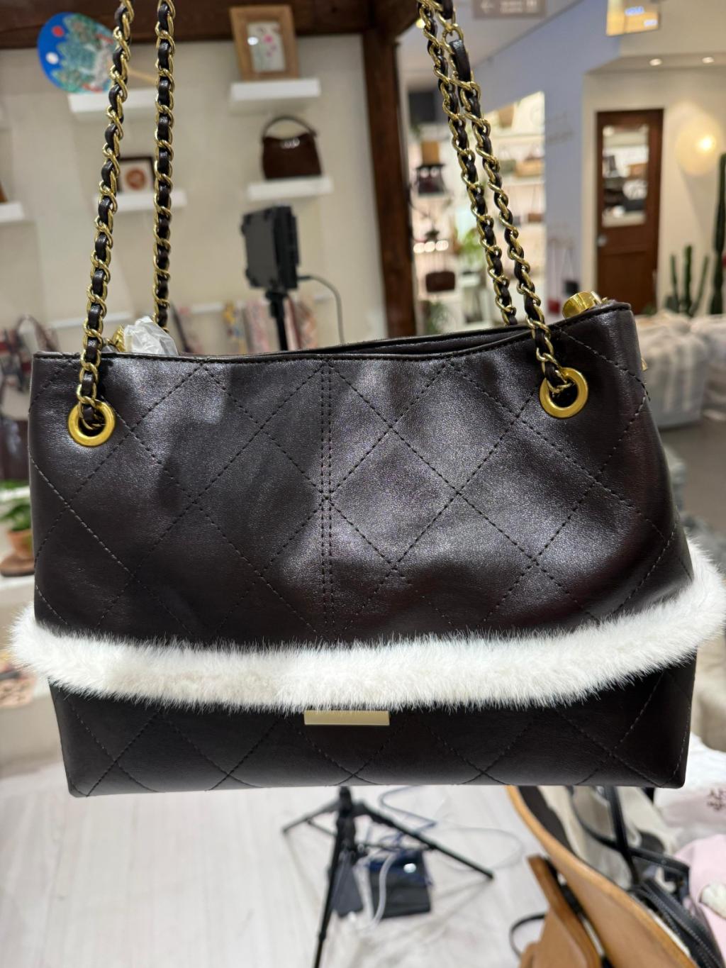 DG4 韓國高質真皮手袋猄皮拼布毛毛小香風袋手柄可拆,3way