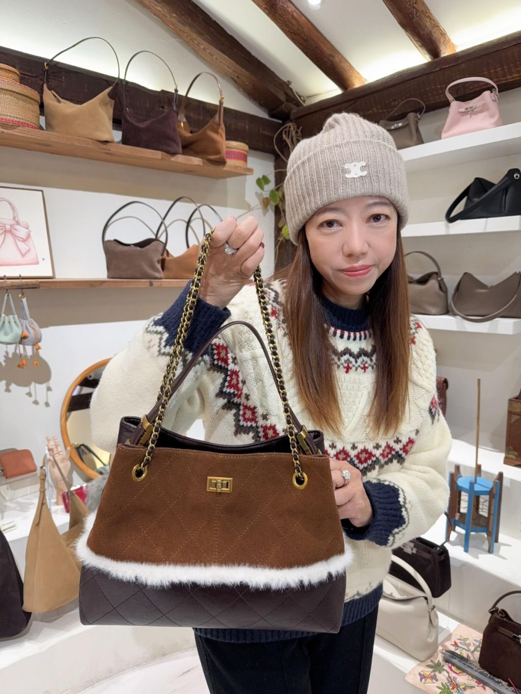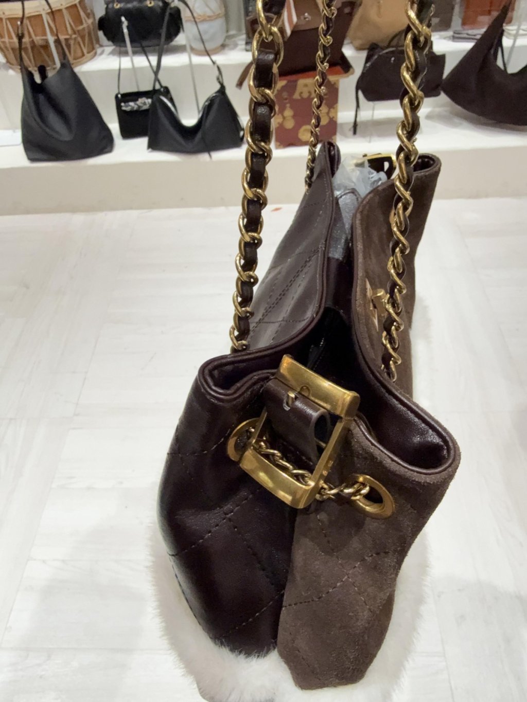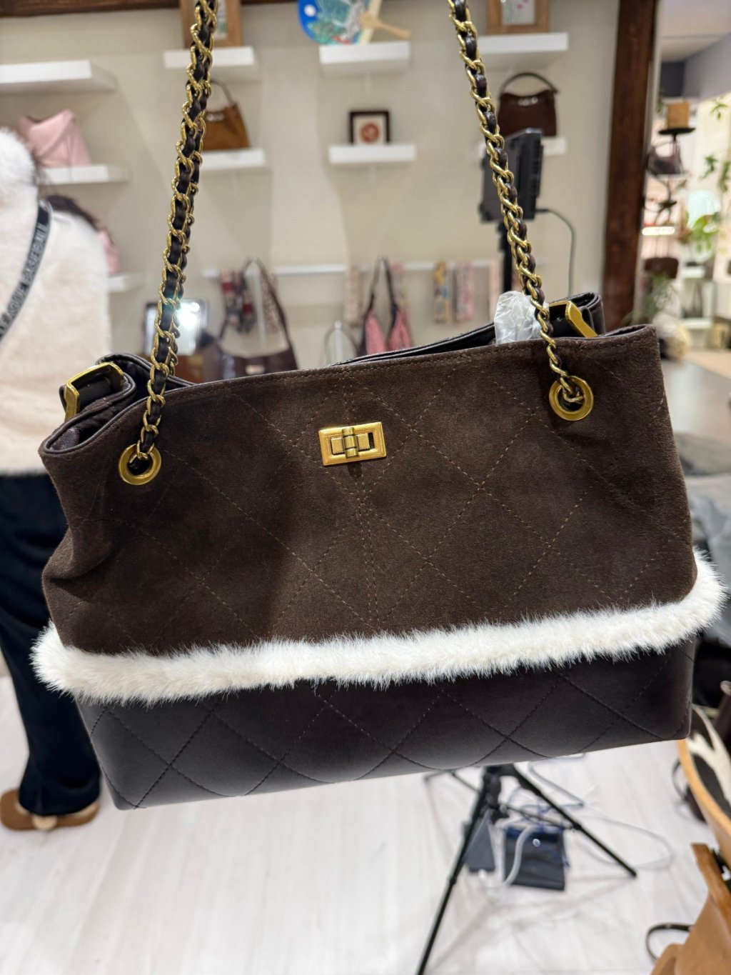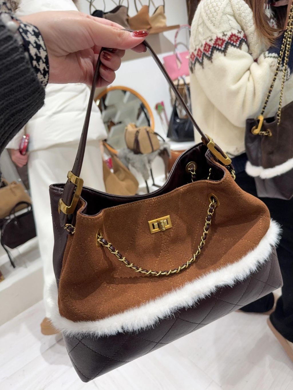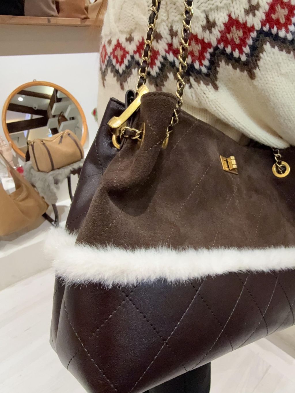 DG4 韓國高質真皮手袋猄皮拼布毛毛小香風袋手柄可拆,3way