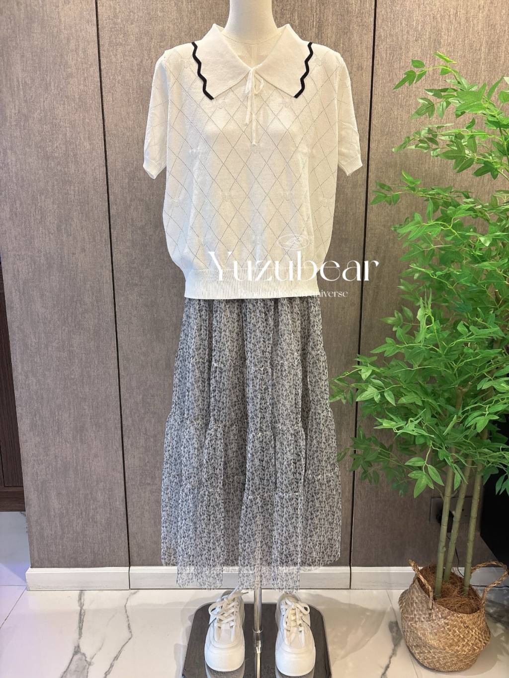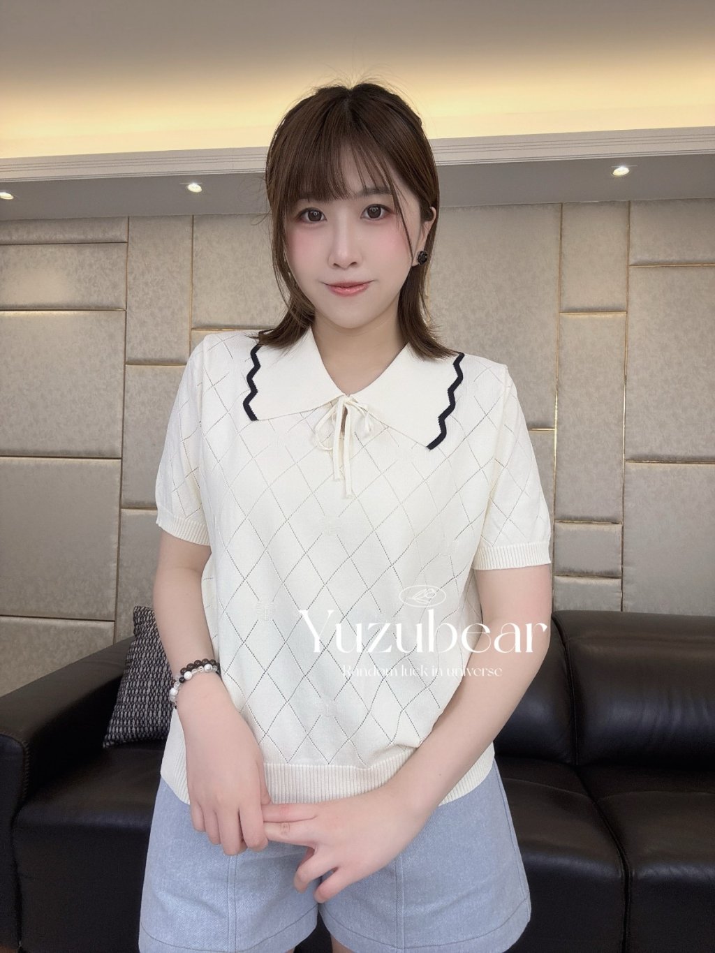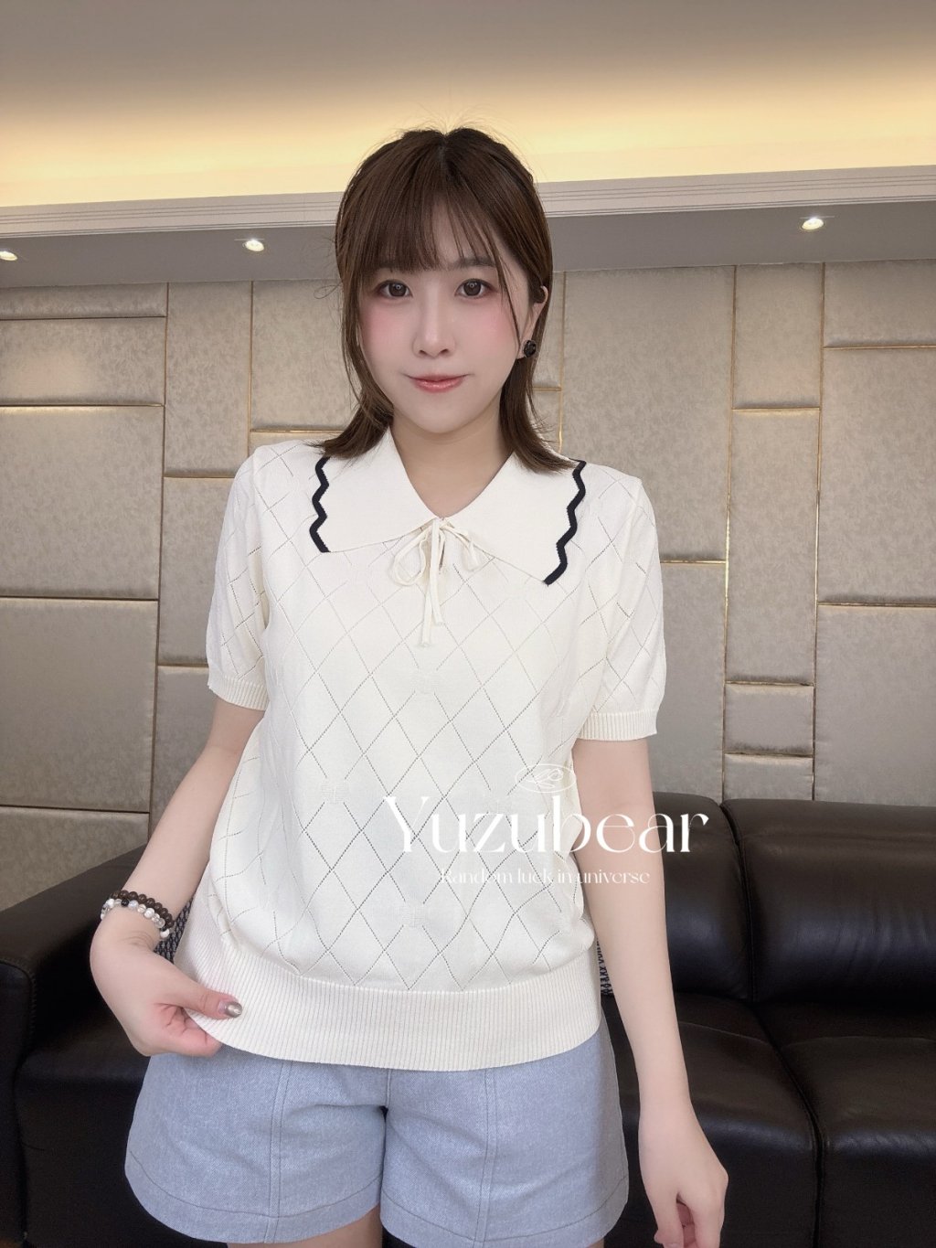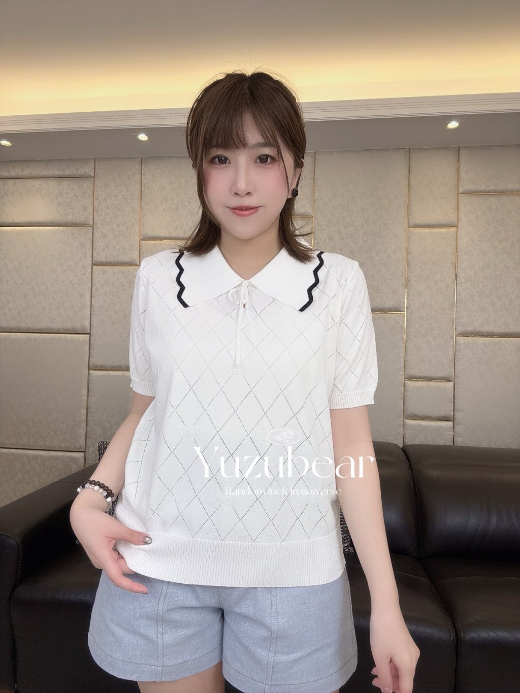 SS79 韓國高質波浪邊翻領暗心心格子紋針織衫