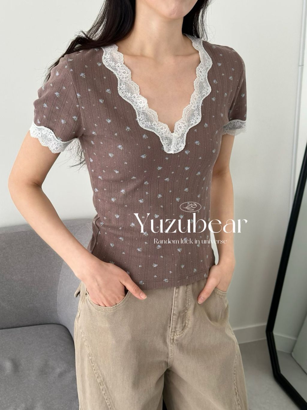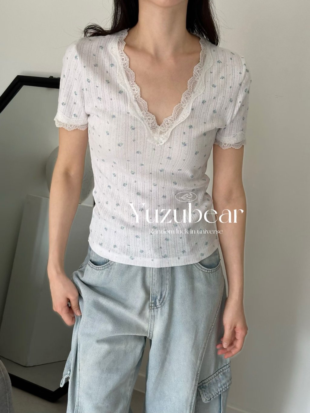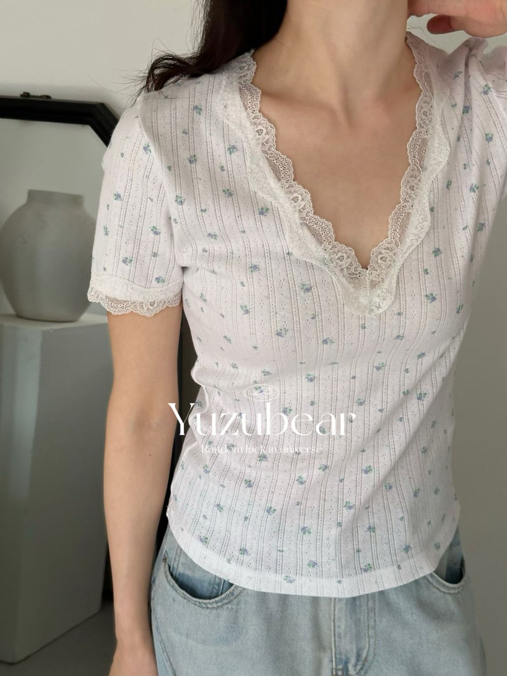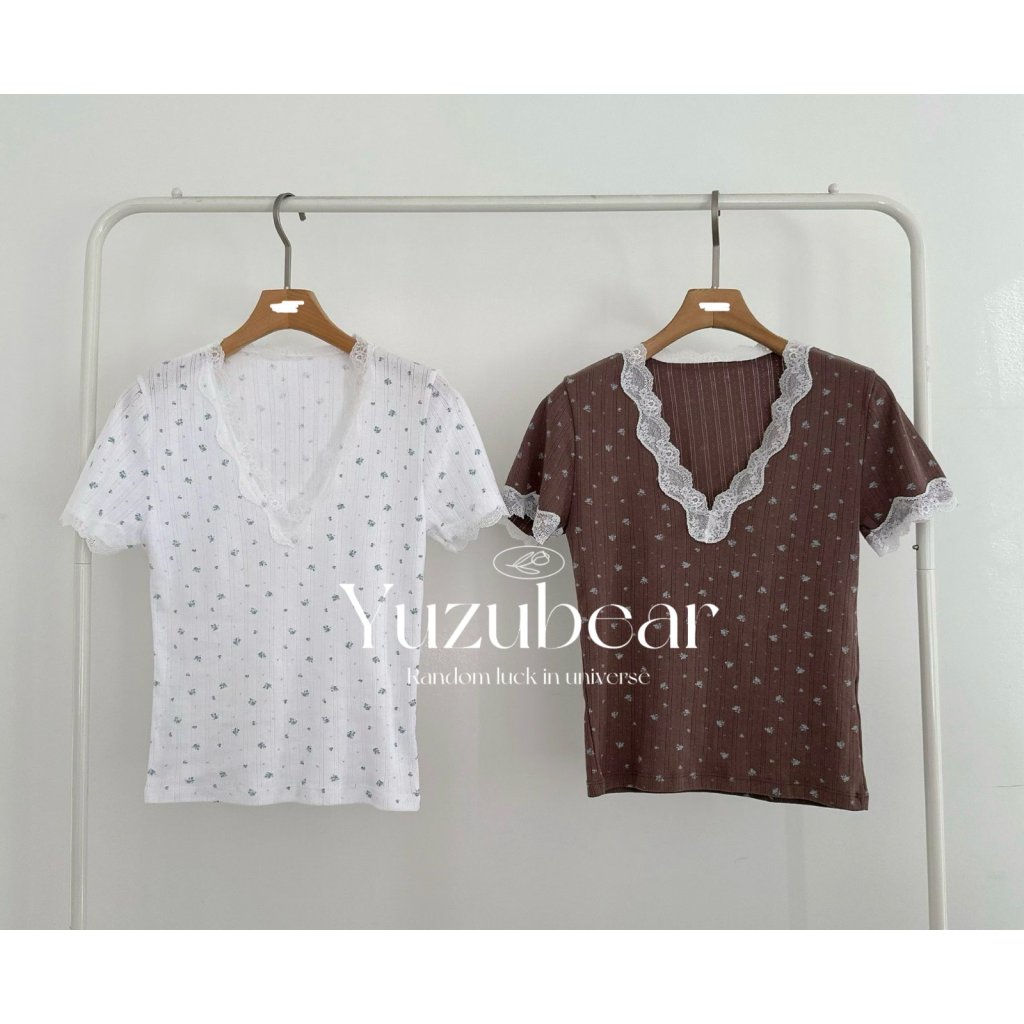 AG10 韓國高質lace V領彈性棉質碎花上衣